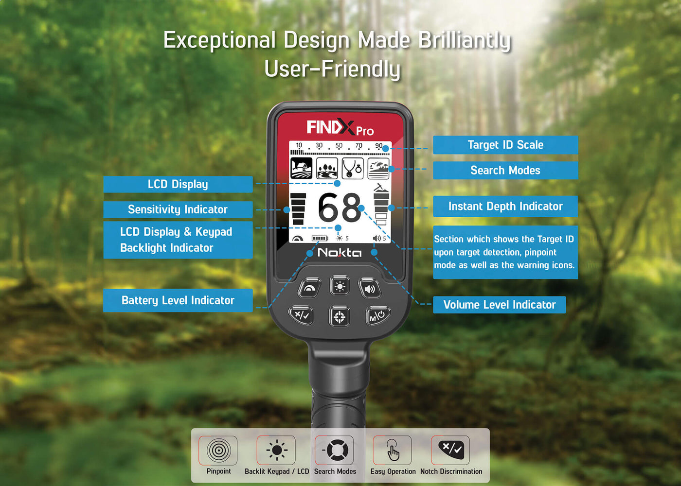 The FINDX PRO has automatic search modes such as Field, Park, Jewelry, and Beach, effortlessly switch between terrains and targets. With its turn-on & go design and simple single menu interface, tuning into specific environments is a breeze for beginners! The Target ID Scale and Sensitivity settings are suitable for everyone, from beginners to professionals, kids to adults.