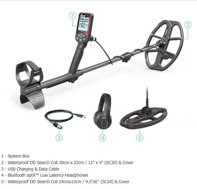 The TRIPLE SCORE Pro Pack includes two coils (SC30 12” x 9” and SC24 9.5” x 6”) and Bluetooth Headphones, PinPointer, Premium Digger, Finds Pouch, Cap.